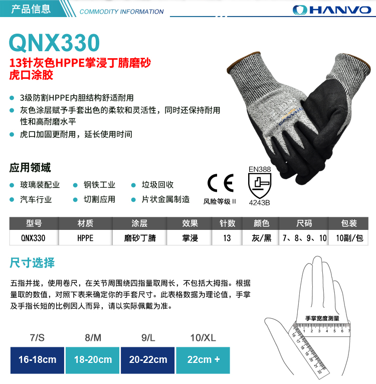 產(chǎn)品名稱:恒輝QNX330磨砂丁腈3級(jí)防割手套
